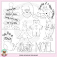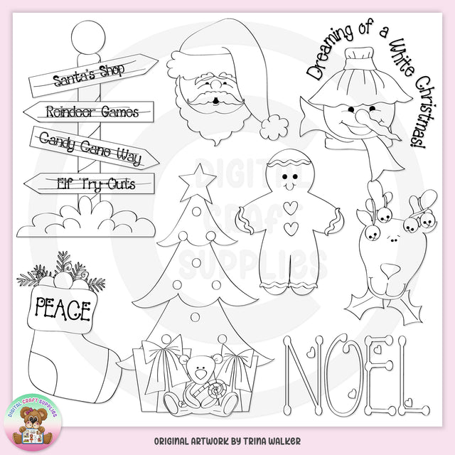 Questa collezione include il Polo Nord con soffice neve e cartelli in legno con la scritta: "Santa's Shop", "Reindeer Games", "Candy Cane Way" e "Elf Try-Outs", Babbo Natale, un pupazzo di neve con "Dreaming Of A White" Word art "Natale", una calza "della Pace" cucita piena di verde, un albero di Natale decorato con regali incartati, un orsacchiotto di peluche e bastoncini di zucchero, un omino di pan di zenzero, una renna con ornamenti e una grafica word art "Noel". Questo set contiene 8 timbri digitali.