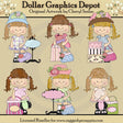 Questa collezione comprende sei dolci bambine, che indossano graziosi abiti fantasia, fiocchi per capelli abbinati e bellissimi cappelli floreali, borse per la spesa boutique, cappelliere boutique, graziose borsette, un cono gelato e insegne boutique decorate, da personalizzare. Questo set contiene 6 grafici.
