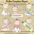 Questa collezione comprende tre neonati che indossano magliette e pannolini fantasia, tre bambine che indossano magliette fantasia, fiocchi per capelli abbinati e pannolini, denti, spazzolini da denti e dentifricio. Questo set contiene 6 grafici.