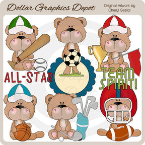 Questa collezione comprende adorabili orsetti sportivi, cappellini da baseball, una palla da baseball, una mazza da baseball, un pallone da calcio, un pezzo d'erba, un trofeo d'oro, una bandierina, un pallone da basket, una pallina da golf, mazze da golf, un pallone da calcio, un pallone da calcio casco, cornice smerlata e grafica con due parole: "All Stars" e "Team Spirit". Questo set contiene 9 grafici.
