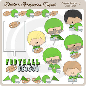Questa collezione include giocatori di football con uniformi da calcio verdi e argento, caschi, palloni da calcio, gagliardetti "Go Team", un palo della porta con il pallone da calcio, la scritta "Stagione calcistica" e due bordi di calcio coordinati. Questo set contiene 10 grafici.