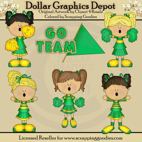 Questa collezione include cinque graziose piccole cheerleader, con abiti da cheerleader verdi e dorati, fiocchi per capelli e pompon, e una grafica word art "Go Team". Questo set contiene 6 grafici.