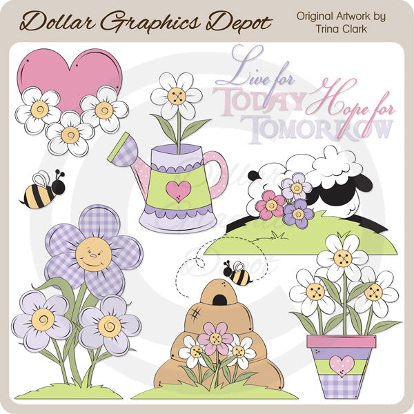 Questa collezione comprende un cuore floreale, un annaffiatoio con un bel fiore, un calabrone, un prato con una pecora e graziosi fiori, un prato con graziosi fiori, un prato con un alveare, un calabrone, e graziosi fiori, un vaso di fiori con graziosi fiori e una grafica word art "Live For Today Hope For Tomorrow". NOTA BENE: questo set si coordina con la collezione "Live For Today - Scrap Papers". Questo set contiene 8 grafici.