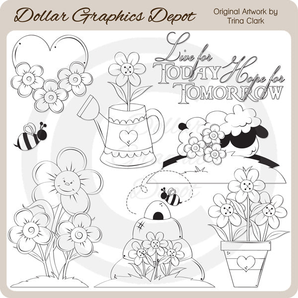 Questa collezione comprende un cuore floreale, un annaffiatoio con un bel fiore, un calabrone, un prato con una pecora e graziosi fiori, un prato con graziosi fiori, un prato con un alveare, un calabrone, e graziosi fiori, un vaso di fiori con graziosi fiori e una grafica word art "Live For Today Hope For Tomorrow". NOTA BENE: questo set si coordina con le collezioni "Live For Today - Clip Art" e "Live For Today - Scrap Papers" . Questo set contiene 8 timbri digitali.