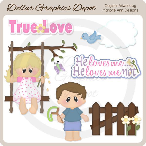 Questa collezione include una dolce bambina che dondola su un'altalena con un fiore e una farfalla, un simpatico ragazzino con una fionda, una staccionata con graziosi fiori, una nuvola, un uccello blu e due parole artistiche: "True Love" e "Mi ama... Non mi ama". Questo set contiene 7 grafici.