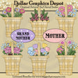 Questa collezione comprende sei cestini intrecciati pieni di fiori colorati, una coccinella, un calabrone e un uccello blu, e due cartelli ovali con le parole "Nonna" e "Madre". Questo set contiene 8 grafici.