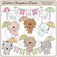 Questa collezione include adorabili cani e gatti, ombrelli, una nuvola di pioggia (duplicata in anteprima) e due graziosi striscioni. Questo set contiene 11 grafici.