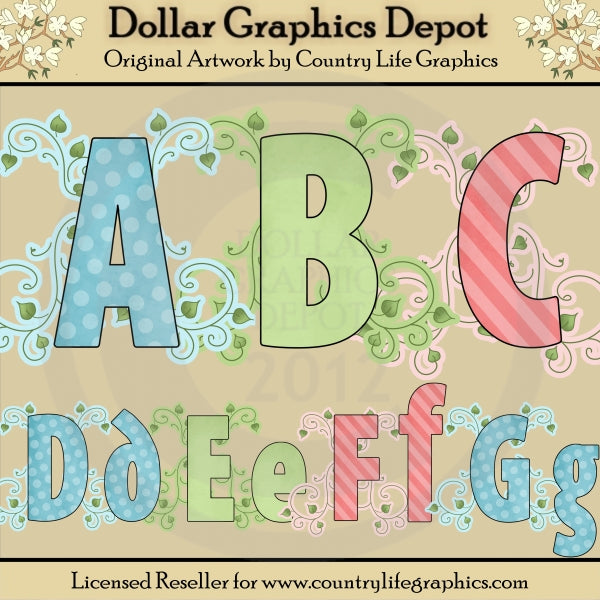 Questa raccolta comprende cinquantadue lettere dell'alfabeto in tinta unita, a pois e a strisce: ventisei lettere maiuscole, con graziosi tralci di edera a scorrimento, e ventisei lettere minuscole. I colori includono: blu, verde e rosa. Questo set contiene 52 grafici.