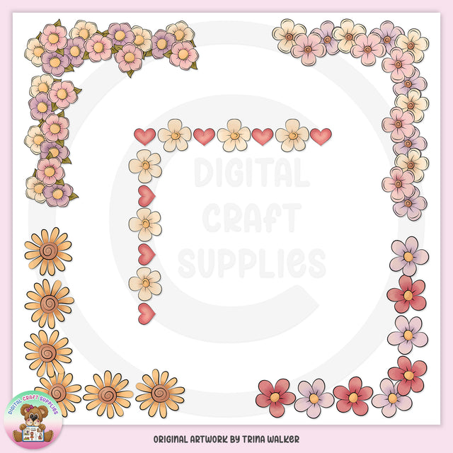 This collection includes five beautiful spring corners with pretty lavender, cream, pink, gold, and brown colored flowers, and red hearts. This set contains 5 graphics.