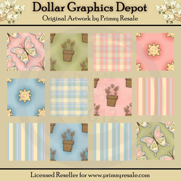 Questa collezione comprende dodici piastrelle per sfondi primaverili con motivi a strisce, a quadri, a vasi di fiori, a farfalle e a sole. Questo set contiene 12 elementi grafici per piastrelle di sfondo. NOTA BENE: questo set si coordina con la collezione grafica "Spring Froggies" .