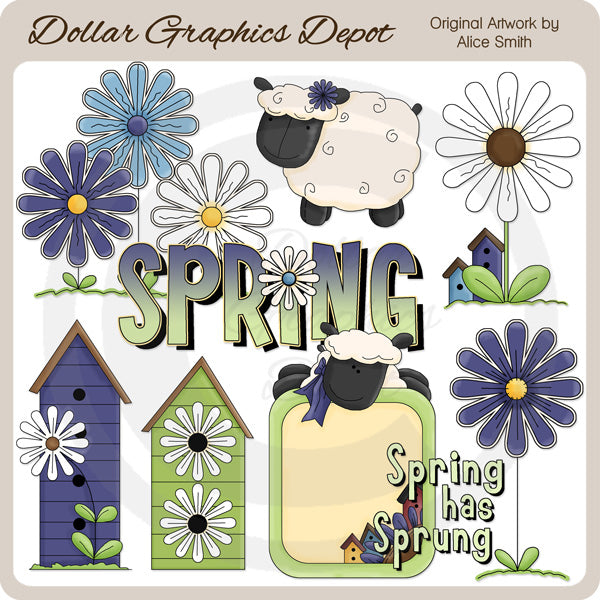 Questa collezione include bellissimi fiori primaverili, graziose casette per gli uccelli, un dolce agnellino, un fiore con la scritta "Spring Has Sprung", una bella cornice (etichetta, etichetta, ecc.) con un agnellino, casette per gli uccelli e un fiore, e uno Grafica word art "Primavera". I colori includono: blu, viola, bianco, giallo, verde, rosso, marrone, marrone chiaro e nero. Questo set contiene 6 grafici.