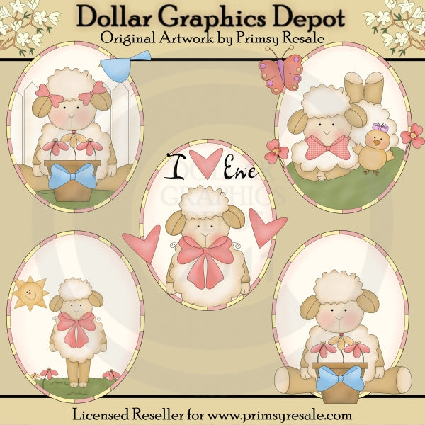 Questa collezione comprende cinque graziosi ovali con cornice rosa e gialla, con cinque adorabili pecore primaverili: una con un vaso di fiori in argilla, fiori primaverili, un grazioso fiocco, un pezzo di erba, una staccionata bianca e un uccello blu, una con un simpatico pulcino, un pezzo di erba, una bella farfalla e fiori primaverili, uno con cuoricini rosa e la scritta "I Love Ewe", uno con un pezzo di erba, fiori primaverili e un sole sorridente e uno con un vaso di fiori in argilla, fiori primaverili, un bel fiocco. Questo set contiene 5 grafici.