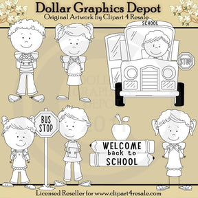 Questa collezione unica nel suo genere è disponibile solo presso Digital Craft Supplies. Questo set include uno scuolabus e l'autista dell'autobus, un bambino e una ragazza che aspettano alla fermata dell'autobus, un bambino e una ragazza che vanno a scuola e una bambina con il suo zaino, tutti con indosso jeans, gonne e magliette, e una matita "Welcome Back To School" e una grafica word art con mela. Questo set esclusivo contiene 6 timbri digitali.