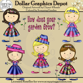 Questa collezione comprende cinque bambine stilizzate, che indossano graziosi vestiti, fiocchi per capelli e cappelli, in rosa, viola, rosso, blu, verde e giallo, graziosi fiori, un vaso di fiori, un annaffiatoio e un "Come va il tuo giardino" Grow" grafica word art. Questo set contiene 6 grafici.