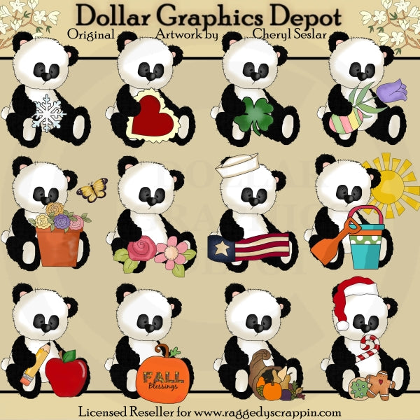 Questa ampia collezione comprende dodici panda stagionali, uno per ogni mese dell'anno: gennaio: un panda con un fiocco di neve, febbraio: un panda con un cuore, marzo: un panda con un trifoglio, aprile: un panda con un grazioso tulipano primaverile e un uovo di Pasqua dipinto, maggio: un orsetto panda con un vaso di terracotta pieno di fiori primaverili colorati e una bella farfalla, giugno: un orsetto panda con graziosi fiori rosa, luglio: un orsetto panda con un cappello da marinaio e un Bandiera americana, agosto: un panda con un secchio di sabbia, una pala e il sole, settembre: un panda con una mela rossa e una matita, ottobre: un panda con una zucca e la scritta "Fall Blessings", novembre: un orso panda con una cornucopia piena di frutti autunnali e dicembre: un orso panda con un cappello da Babbo Natale, un bastoncino di zucchero, un omino di pan di zenzero e un biscotto di Natale. Questo set contiene 12 grafici.