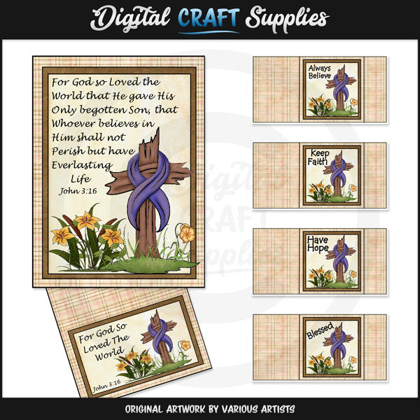 Questa collezione unica nel suo genere è disponibile solo presso Digital Craft Supplies. Questa collezione comprende quattro mini involucri per barrette di cioccolato, un topper coordinato per borsa 3 x 4 e un inserto coordinato. Il testo su ciascuno dei mini involucri delle barrette di cioccolato recita come segue: "Credi sempre", "Mantieni fede", "Abbi speranza" e "Blessato". Il testo sulla parte superiore della borsa recita: "Poiché Dio ha tanto amato il mondo - Giovanni 3:16". Il testo sull'inserto recita: "Poiché Dio ha tanto amato il mondo che ha dato il suo Figlio unigenito, affinché chiunque crede in lui non perisca, ma abbia vita eterna - Giovanni 3:16". I disegni includono graziosi fiori primaverili e una bellissima croce su una collina erbosa. Questo set esclusivo contiene 6 stampabili individuali (involucri, topper e inserto) e 2 pagine "Pronte per la stampa" (non mostrate nell'anteprima).