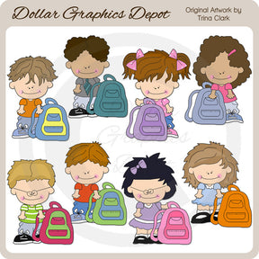 Questa collezione comprende adorabili ragazzini e ragazze con zaini colorati. Questo set contiene 8 grafici.