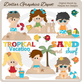 Questa ampia collezione comprende adorabili ragazzini e ragazze, tanta sabbia, stelle marine, un granchio, occhiali da sole, secchielli e pale per la sabbia, un castello di sabbia, una barca a vela, una palma, un pallone da spiaggia, fiori tropicali e grafica con due parole: "Vacanze tropicali" e "Sabbia e surf". Questo set contiene 12 grafici.