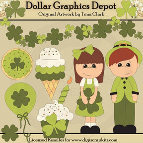 Questa collezione comprende un ragazzo irlandese vestito con un vestito verde e un cappello da folletto, una ragazza irlandese vestita con un vestito verde e un grazioso fiocco per capelli, quadrifogli, quadrifogli, un palloncino da festa, un biscotto decorato, un cono gelato, un cupcake glassato con una candela e un bordo di trifoglio e trifoglio. Questo set contiene 10 grafici.