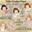 Questa collezione comprende sei adorabili ragazze per la festa nuziale, che indossano graziosi vestiti, fiocchi per capelli e un velo da sposa, mazzi di fiori nuziali, un bellissimo arco nuziale con rose rosa rampicanti e campanelle nuziali, un bicchiere nuziale scanalato, una torta nuziale splendidamente decorata, campanelle nuziali e grafica con tre parole: "Will You Be My Bridesmaid", "Will You Be My Maid Of Honor" e "My Wedding Day". Questo set contiene 9 grafici.