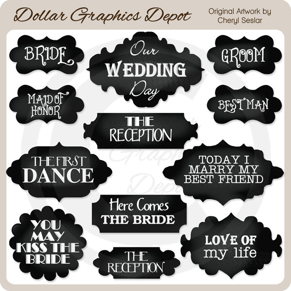 Questa ampia collezione comprende dodici cornici per lavagna "Wedding Day", con le seguenti parole artistiche: "Our Wedding Day", "Bride", "Groom", "Maid Of Honor", "Best Man", "The Reception (2), "Il primo ballo", "Oggi sposo il mio migliore amico", "Ecco la sposa", "Puoi baciare la sposa" e "L'amore della mia vita". Questo set contiene 12 grafici.