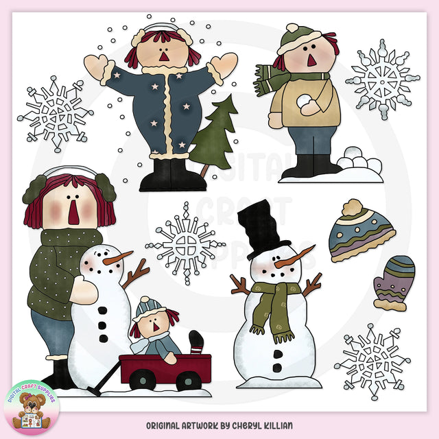 Questa collezione include bambole di pezza impacchettate che indossano maglioni, stivali, sciarpe, cappelli e paraorecchie, neve, un albero di pino, palle di neve, pupazzi di neve, un carro rosso con una piccola bambola Annie, un cappello invernale, un guanto e tre graziose fiocchi di neve (uno duplicato nell'anteprima). Questo set contiene 9 grafici.