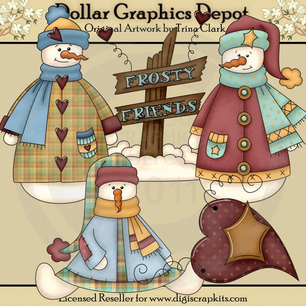 Questa collezione comprende tre adorabili pupazzi di neve invernali, con cappotti invernali, cappelli, sciarpe, nasi di carota, piccole stelle e cuori, un cartello invernale innevato con la scritta "Frosty Friends" e un grazioso cuore a pois, con una stella dorata e un filo attorcigliato. . Questo set contiene 5 grafici.