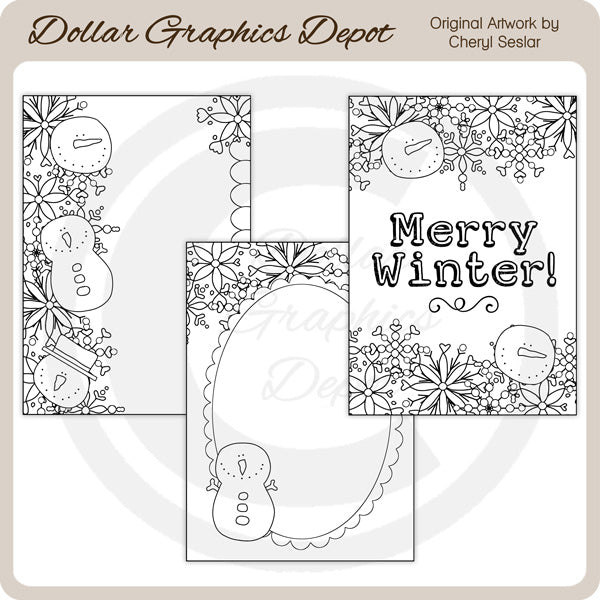 Questa collezione include tre cartoncini disegnati a mano sul davanti da 5 x 7 pollici, con fiocchi di neve invernali, graziosi pupazzi di neve e uno con la scritta "Merry Winter". Questo set contiene 3 frontali di carte stampabili.