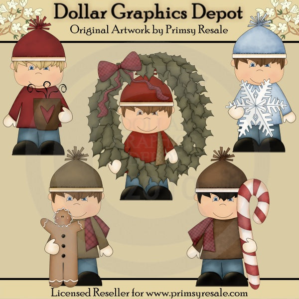 Questa collezione comprende cinque ragazzini, che indossano blue jeans, maglioni, sciarpe, guanti e cappelli invernali in rosso, blu, marrone, kaki e beige, una tazza di cioccolata calda, una grande ghirlanda con un grazioso fiocco, un fiocco di neve, un omino di pan di zenzero e un bastoncino di zucchero. Questo set contiene 5 grafici.