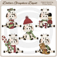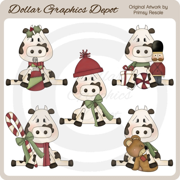 Questa collezione include adorabili mucche maculate, sciarpe invernali, un cappello invernale, graziosi fiocchi, foglie di bacche di agrifoglio, campanella di Natale, caramelle alla menta piperita, soldatino, regalo di Natale incartato, bastoncino di zucchero e orsacchiotto di peluche. Questo set contiene 5 grafici.