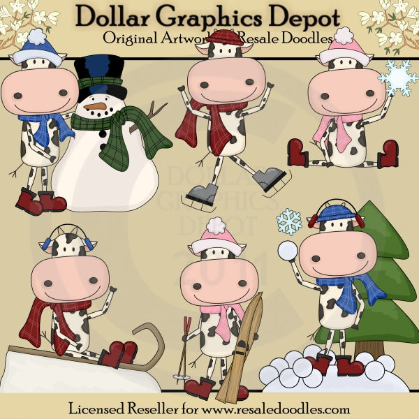 Questa collezione comprende sei adorabili mucche maculate, vestite con scarponi da neve, pattini da ghiaccio, cappelli invernali, sciarpe invernali e cuffie antirumore, un pupazzo di neve con cappello a cilindro e sciarpa invernale, colline innevate, palle di neve, un pino, uno slittino, un paio di sci di legno e graziosi fiocchi di neve. Questo set contiene 6 grafici.