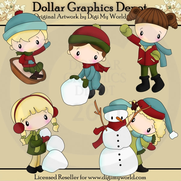 Questa collezione include adorabili ragazzini e ragazze, vestiti con cappotti invernali, cappelli, sciarpe e stivali, uno sta cavalcando uno slittino, uno sta facendo rotolare una palla di neve, uno sta costruendo un pupazzo di neve, uno sta salutando e uno è in piedi con un pupazzo di neve. Questo set contiene 5 grafici.
