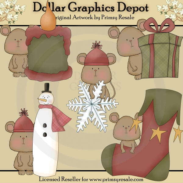 Questa collezione comprende cinque adorabili topolini invernali, una grossa candela natalizia, un regalo di Natale incartato con un grazioso fiocco, una calza di Natale con piccole stelle dorate, un pupazzo di neve invernale con cappello a cilindro e sciarpa e un grazioso fiocco di neve. Questo set contiene 5 grafici.
