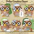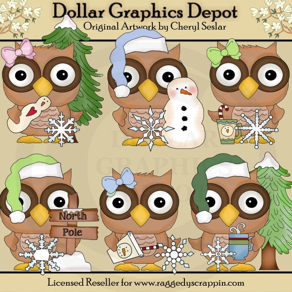 Questa collezione include sei adorabili gufi invernali con cappelli invernali, graziosi fiocchi per capelli, fiocchi di neve, pini innevati, un pupazzo di neve ghiacciato, un biscotto pupazzo di neve, cioccolata calda in una tazza con un agitatore per bastoncino di zucchero, neve, un cartello innevato che recita: " Polo Nord", una tazza di cioccolata calda da asporto e caffè/tè caldo in una tazza. Questo set contiene 6 grafici.