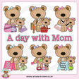 Questa collezione include adorabili orsetti di mamma e figlia con graziosi fiocchi per capelli, borse della spesa, portamonete, una pentola, tagliere, coltello, carote, un fungo, latte in tazze da asporto, un cartello "Grande vendita di oggi", un dollaro banconota, mascara, rossetto, bottiglie di smalto, un cartello "Grand Opening Today" e una grafica word art "A Day With Mom". Questo set contiene 7 grafici.