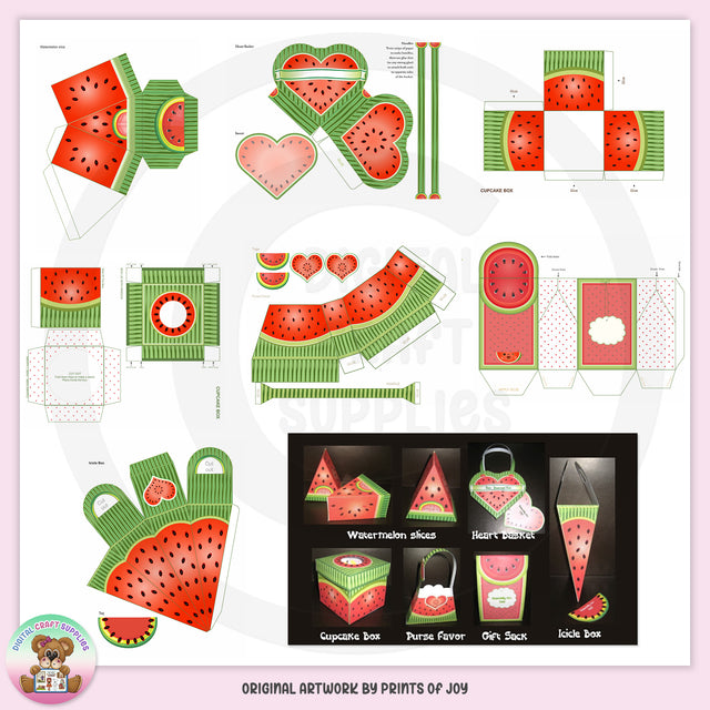 Questa ampia collezione comprende sette fogli stampabili, con le seguenti sei creazioni stampabili: 1 scatola per fette di anguria, 1 cestino a forma di cuore con inserto, 1 scatola per cupcake con supporto (2 fogli), 1 portaconfetti con etichette regalo, 1 sacchetto regalo (scatola pizzico) e 1 scatola di ghiaccioli con etichetta regalo. BONUS: questa raccolta include anche un e-book e fogli di istruzioni (con foto). Assicurati di leggere le Condizioni d'uso delle "Collezioni stampabili" relative agli e-book. NOTA BENE: il riquadro fotografico mostra i mestieri "finiti", solo a scopo illustrativo. Riceverai 7 fogli stampabili, per un totale di 6 creazioni.