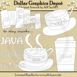 Questa collezione include una tazza con piattino piena di moka, una tazza con piattino piena di caffè fumante, una tazza da asporto piena di latte e quattro grafiche word art per il caffè: "Java", "Latte", "Mocha" e "Pausa caffè per restare svegli". Questo set contiene 7 timbri digitali.