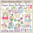Questa vasta collezione include coniglietti pasquali, cestini pasquali pieni, cestini pasquali vuoti (da riempire), uova di Pasqua dipinte, graziosi tulipani primaverili, una farfalla, un calabrone, marshmallow Peeps, caramelle gommose e tre grafiche di word art pasquali - " Hoppin Down The Bunny Trail, "Easter Egg Hunt" e "Happy Easter." Questo set contiene 21 elementi grafici.