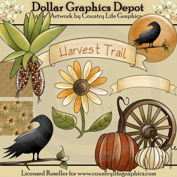 Questa collezione include un corvo nero su un ramo di un albero, steli di mais indiano, un bel fiore marrone e oro, una ruota di carro in legno, con zucche autunnali bianche e arancioni, una luna splendente, con un corvo nero su un ramo di un albero, un banner con la scritta "Harvest Trail", un banner vuoto, da personalizzare, e due sfondi di carta sgangherati abbinati: uno con punti e uno con fiori. Questo set contiene 9 grafici.