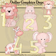 Questa collezione include cinque adorabili bambine della giungla e i numeri da 1 a 5: un leone con il numero 1, un ippopotamo con il numero 2, una scimmia con il numero 3, una giraffa con il numero 4 e un elefante con il numero 5 Questo set contiene 5 elementi grafici.