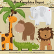 Questa collezione comprende una giraffa, un alligatore, un ippopotamo, un elefante, un leone e una palma. BONUS: questo set include una scena nella giungla (non mostrata). Questo set contiene 7 grafici.