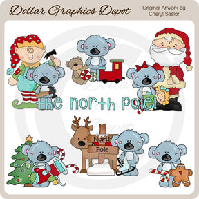 Questa collezione include adorabili koala natalizi, Babbo Natale, un simpatico elfo, martelli per costruire giocattoli, un orsacchiotto di peluche, caramelle alla menta piperita, un trenino giocattolo choo-choo, una bambolina, un albero di Natale decorato, una calza piena di caramelle bastoncini di zucchero, una serie di luci natalizie, neve, un cartello di legno con la scritta: "Polo Nord", una renna, pattini da ghiaccio, un bastoncino di zucchero, un omino di pan di zenzero e una grafica word art "Il Polo Nord". Questo set contiene 7 grafici.