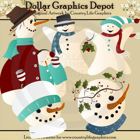 Questa collezione comprende pupazzi di neve invernali e teste di pupazzi di neve, con cappotti invernali, sciarpe, guanti, cappelli, rami di bacche di agrifoglio, foglie di bacche di agrifoglio, bottoncini e nasi di carota. Questo set contiene 5 grafici.