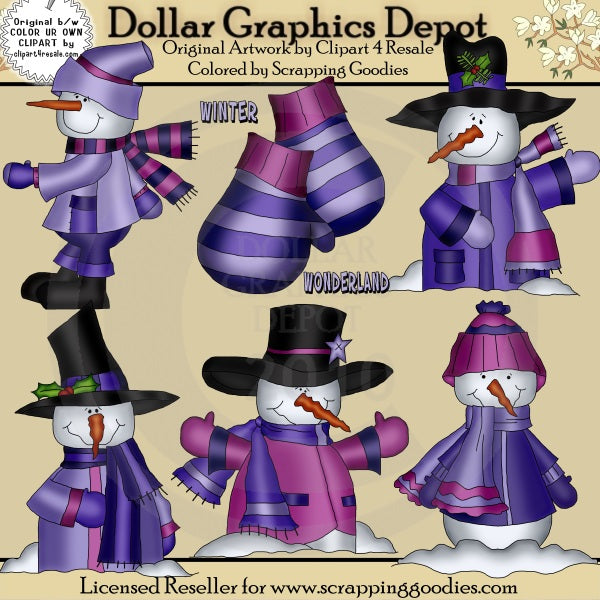 Questa collezione comprende cinque pupazzi di neve invernali, vestiti con cappotti, cappelli, sciarpe e guanti invernali, tanta neve, foglie di bacche di agrifoglio, una stella e una grafica word art "Winter Wonderland". I colori includono: viola, rosa, nero, verde, arancione e bianco. Questo set contiene 6 grafici.