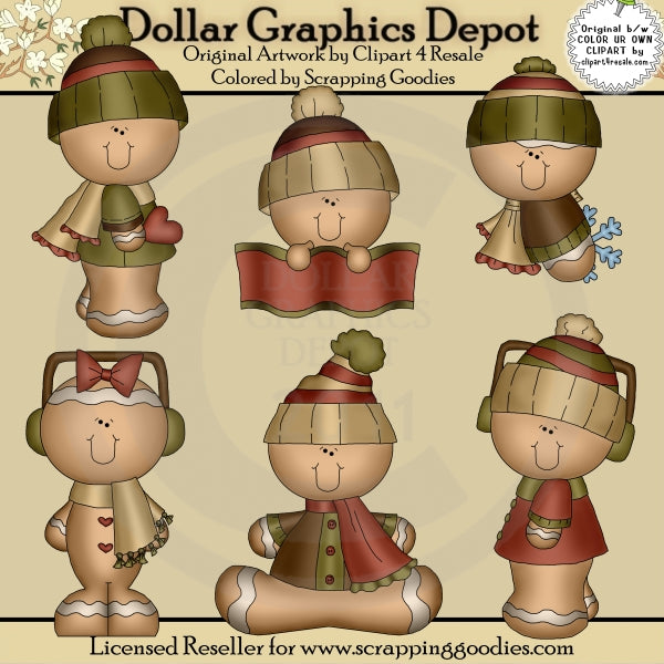 Questa collezione comprende sei adorabili uomini e donne di pan di zenzero, vestiti con cappotti invernali, cappelli, sciarpe, cuffie antirumore e un grazioso fiocco, un cuoricino, un fiocco di neve e uno striscione da personalizzare. I colori includono: marrone, kaki, arancione bruciato, verde pino, bianco e blu. Questo set contiene 6 grafici.