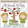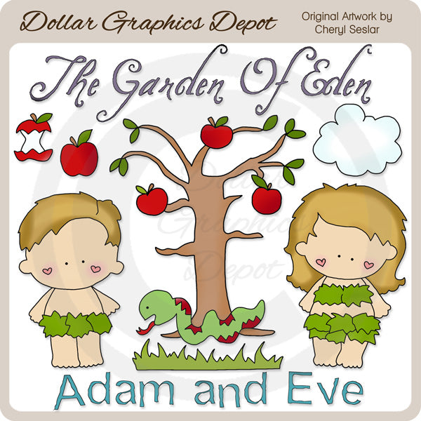 This collection includes Adam and Eve, a puffy cloud, a patch of grass, a snake, two apples, an apple tree, and two word art graphics - "The Garden Of Eden" and "Adam and Eve." This set contains 10 graphics.