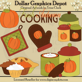 This collection includes a fall pumpkin, an apple pie and frosted cupcakes, flour and sugar canisters, a sugar bowl and salt and pepper shakers, a hand mitt, an oven mitt, and one "Fresh Autumn Cooking" word art graphic. PLEASE NOTE: This set coordinates with the "Autumn Kitchen - Scrap Papers" collection.This set contains 7 graphics.