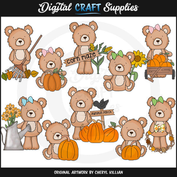 This collection includes ten adorable little autumn bears with colorful autumn leaves, a rake, fall pumpkins, a "Corn Maze" sign, corn stalks, a sunflower, a wooden wagon filled with pumpkins, a watering can with pretty flowers, a "Pumpkin Patch" sign, a black crow, and a pretty fall wreath. This set contains 10 graphics.