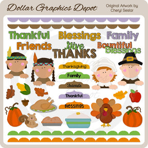 This HUGE collection includes an Indian boy and girl, a pilgrim boy and girl, fall pumpkins, a turkey, a cute little squirrel, colorful autumn leaves, an acorn, roast turkey on a platter, a bowl of mashed potatoes, a corn cob, an apple, a pie, five pretty tabs - "Thanksgiving," "Family," "Friends," "Thankful," and "Blessings," four scalloped borders - lavender, brown, green, and orange, and five Thanksgiving word art graphics - "Thankful," "Blessings," "Family," "Friends," "Give Thanks," and "Bountiful Blessings." PLEASE NOTE: This set coordinates with the "Bountiful Blessings - Scrap Papers," "Bountiful Blessings Bag Toppers," "Thankful Bag Toppers," and "Thankful Mini Candy Pouches" collections. This set contains 32 graphics.