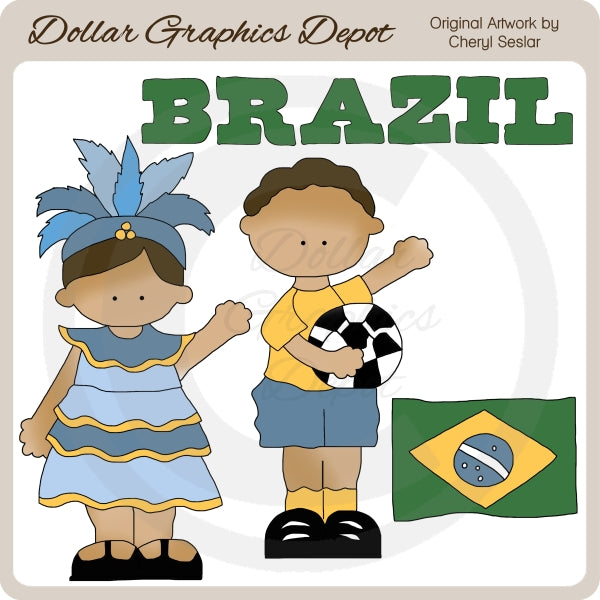 This collection includes a Brazilian boy with a soccer ball, a Brazilian girl with a pretty feather hat, a Brazilian flag, and one "Brazil" word art graphic. This set contains 4 graphics.